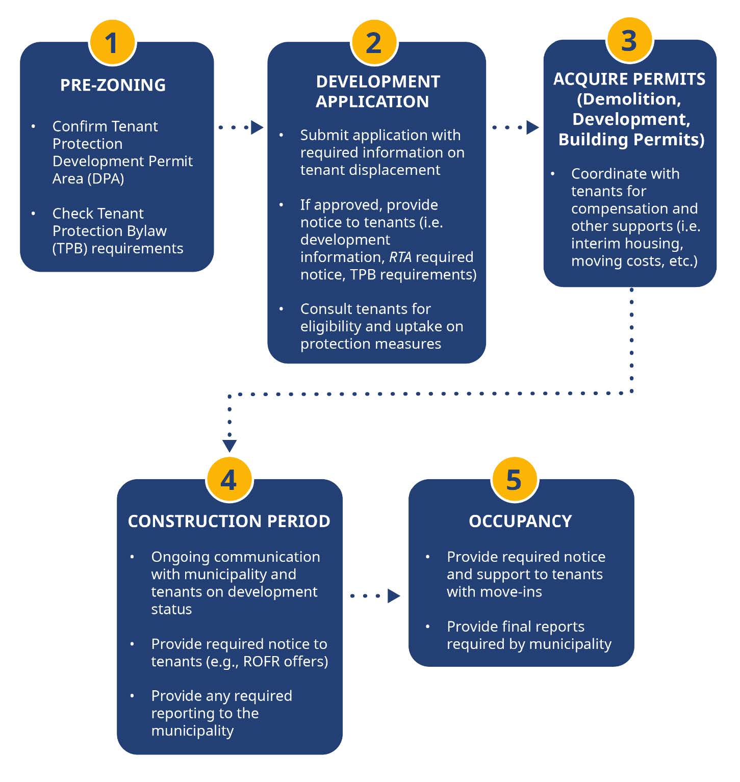 By providing municipalities with this new authority, the amended legislation helps ensure densification efforts can continue while addressing the negative impacts on displaced tenants. A detailed overview of TPBs is provided in Part 3 – Implementing Tenant Protection Bylaws.